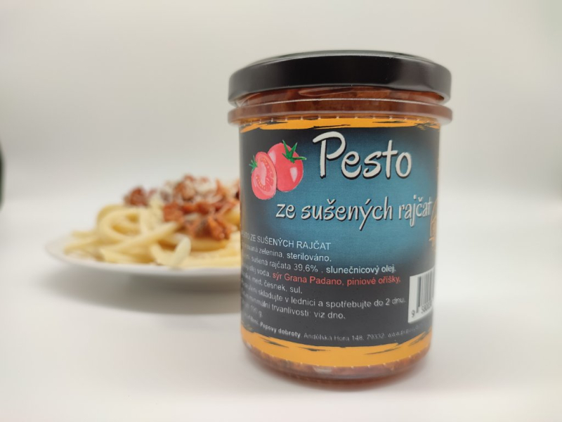 Pesto obsahuje až 39,6% sušených paradajok, ktoré sú z českých výpestkov. Vychutnajte si lahodnú chuť paradajok s cestovinami, hriankami alebo s mäsom.