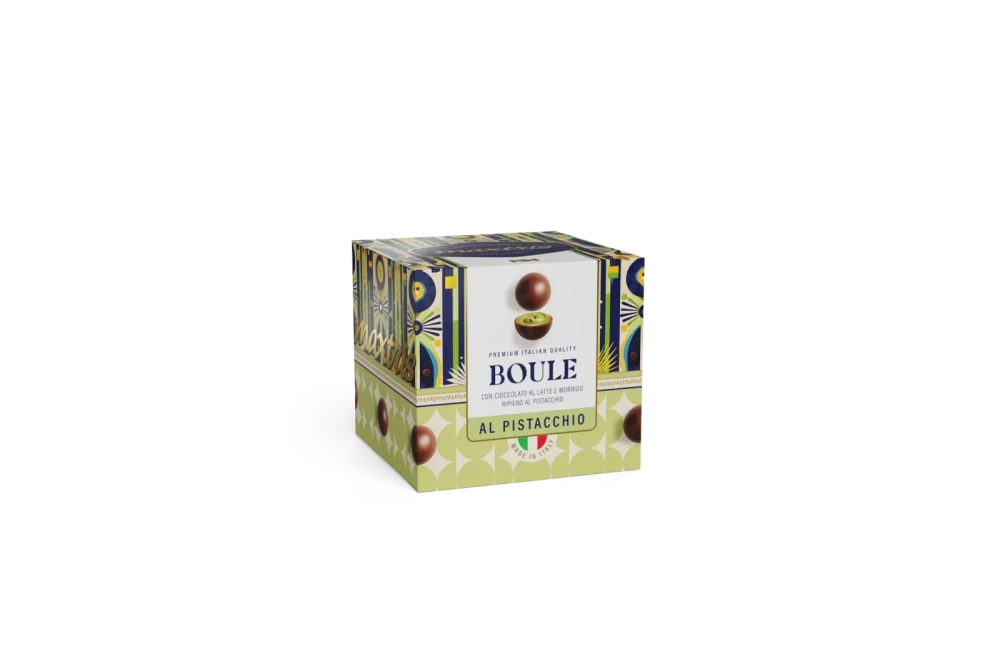 Guličky z mliečnej čokolády plnené bielym krémom s príchuťou pistácií.